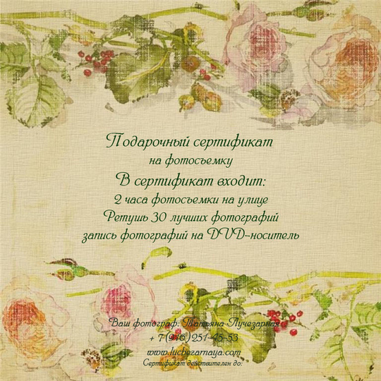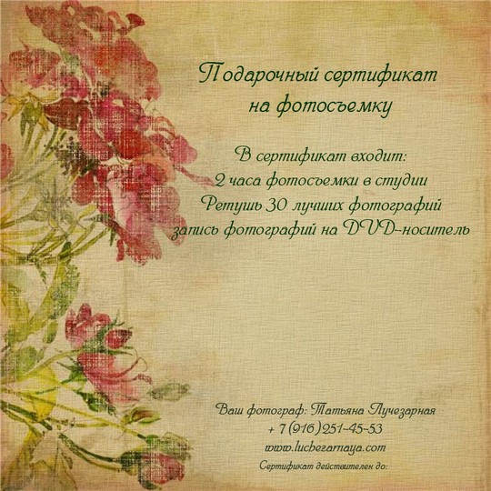 По запросу я изготавливаю индивидуальный сертификат и добавляю в него желаемые пункты: количество часов фотосъемки, наличие стилиста, съемка в студии и т.д.